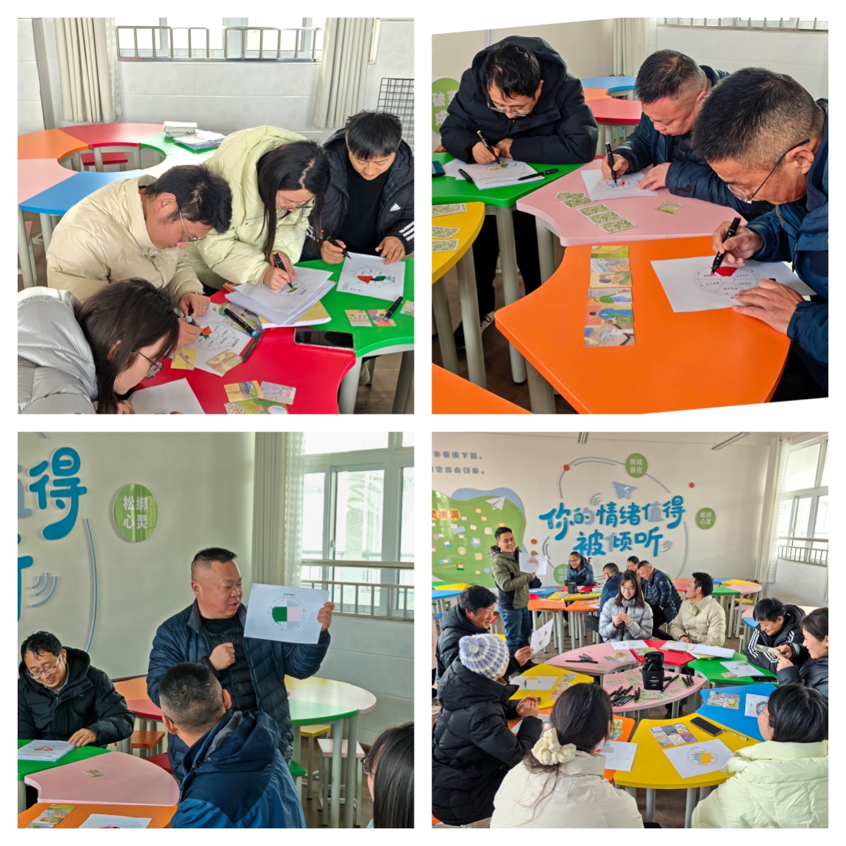 在安全、开放的团体氛围中,多位班主任主动分享了自己的“生命平衡轮”。有人谈及工作中的成就感与压力,有人分享家庭与自我时间的平衡之道,也有人坦诚面对成长中的迷茫与期待。真诚的倾诉引发了广泛共鸣,现场不时响起理解的掌声与温暖的笑声。这种深度交流不仅增强了彼此的理解,也让老师们感受到来自团队的支持与陪伴。