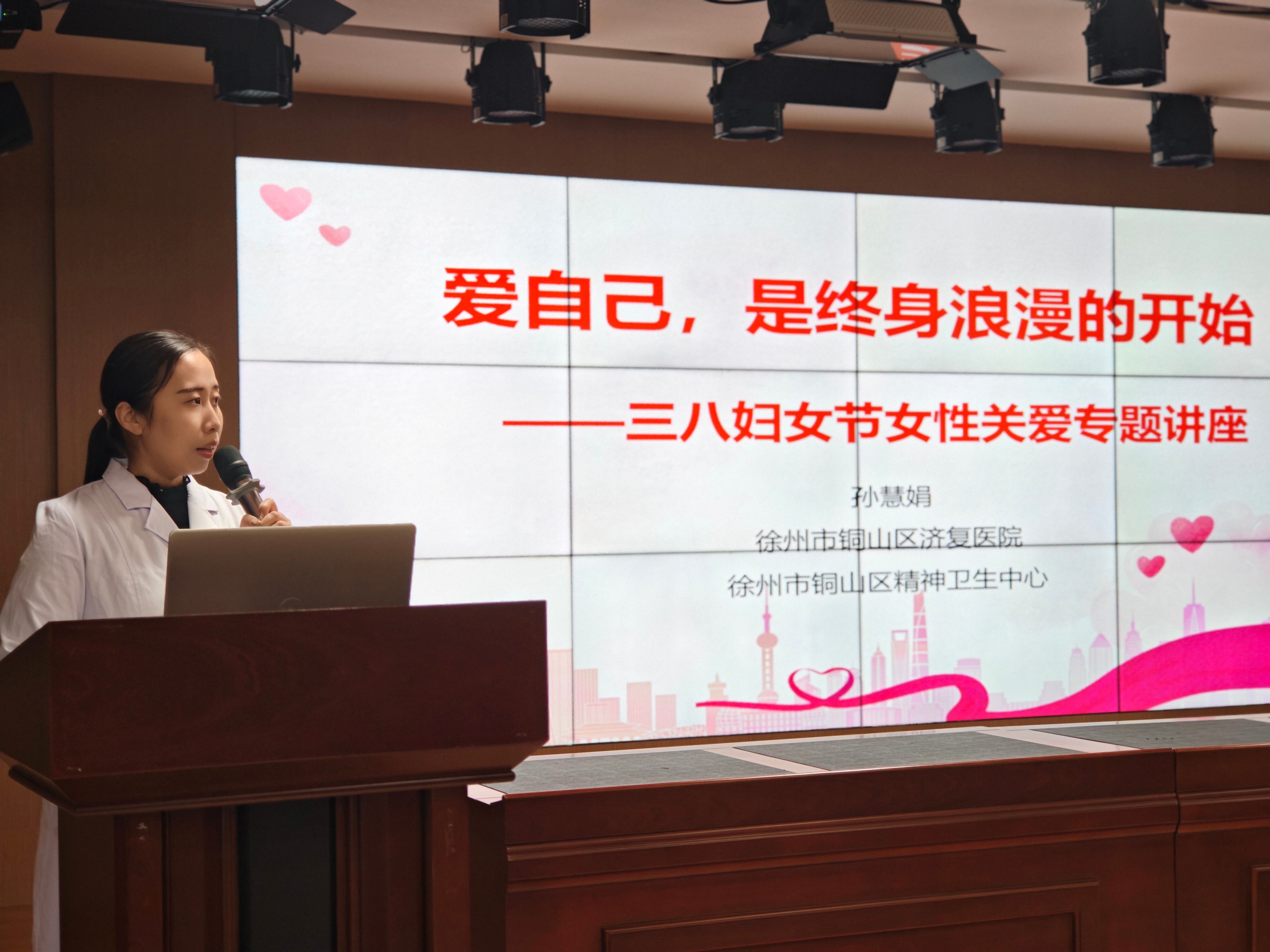 三月春风暖,巾帼绽芳华。为庆祝第116个“三八”国际妇女节,关爱全院女性职工的心理健康,提升女性自我关注意识与心理调适能力,3月6日下午,徐州市铜山区济复医院精心组织了一场主题为“爱自己,是终身浪漫的开始”的女性关爱专题讲座。本次讲座旨在向辛勤耕耘在医疗战线的女性医务工作者们送上一份特殊的节日礼物,引导大家在忙碌的工作与生活中学会审视自我、关爱自我,以更加积极饱满的状态投身于精神卫生事业。