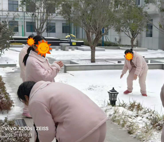 今年的第一场雪已经落下,整个医院银装素裹,白茫茫一片。在做好保暖措施和安全保障的前提下,二病区的患者在医护人员的带领下来到院区活动场,共同感受雪中乐趣。